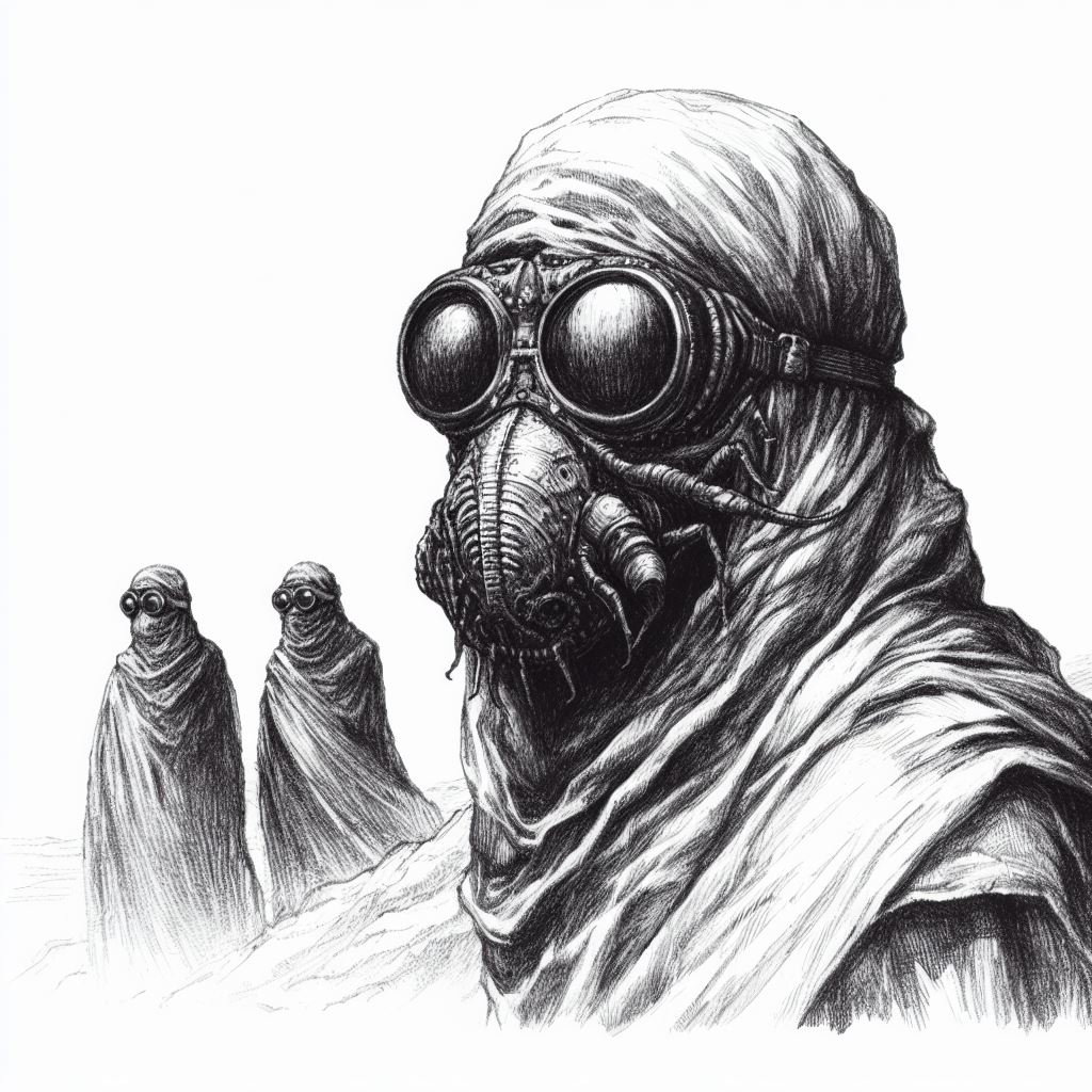 Then, with supplies in hand, goggles covering eyes, and with a short, fat proboscis of a desert spider crab pressing each of their tongues down, Archimenas, Maro, and Phaelon set out to the winds.