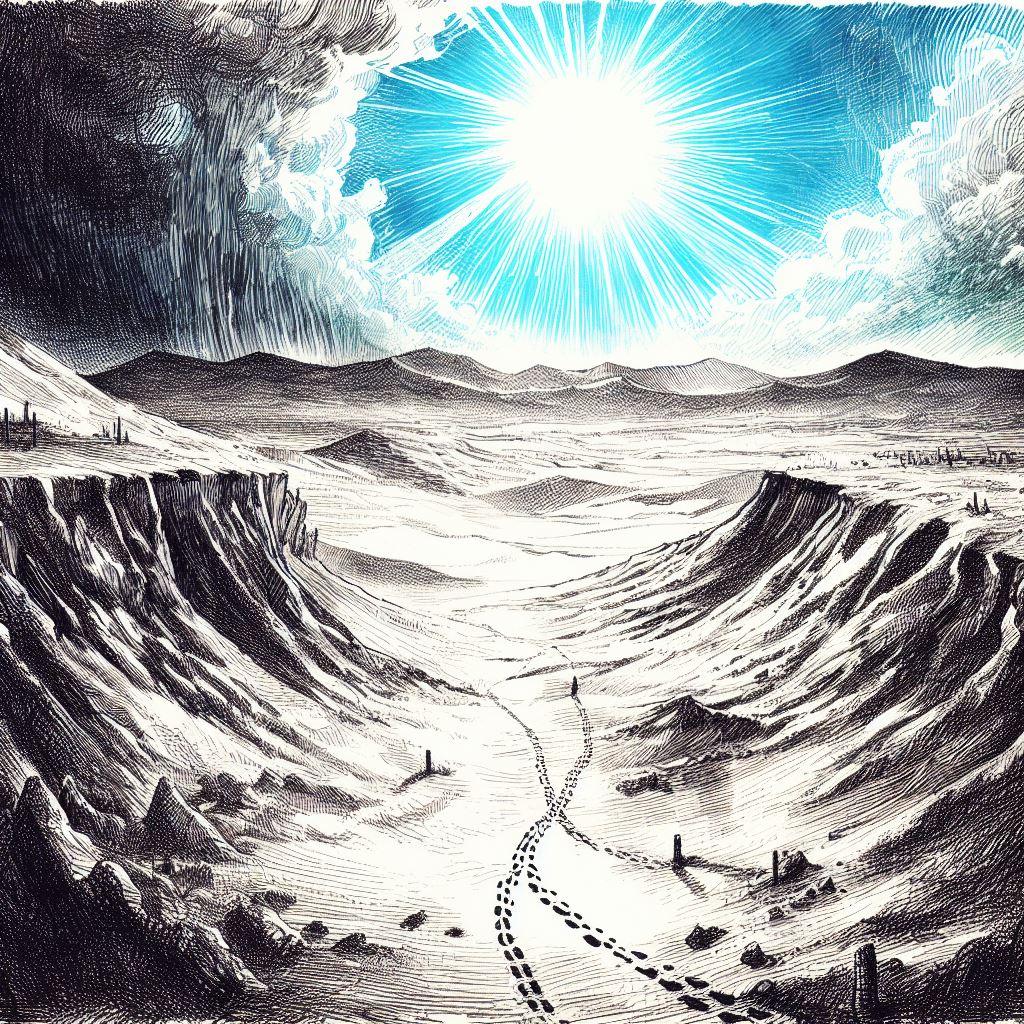 Lately, doubt began to creep into Archimenas’s mind. It even seemed to bend the intention and light emitted from Sol as it passed through his fingers earlier that morning. Was this really to be the destiny of their people forever? To wander the blown landscape inside their protected radius? The hem of the iteration mother’s robes appeared tattered to him in that moment earlier, like the edge of their little-known world, its white fabric seemingly dirtied by his thoughts. He had suppressed the nonsensical ideas during the ceremony but up here the feeling returned.